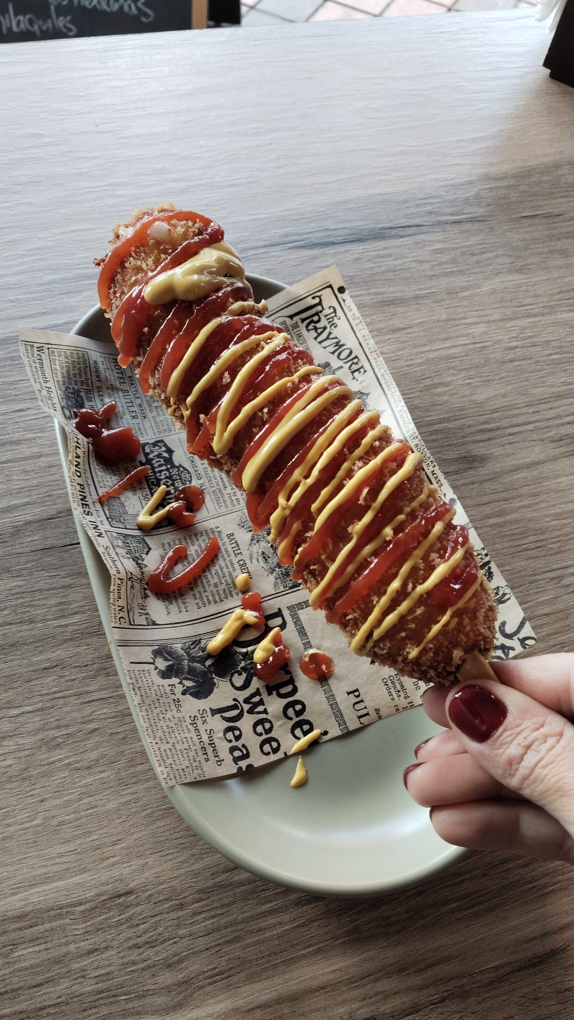 Clásico de corea, salchicha y queso intercalado en una varilla, rebosado en una masa esponjosa, frito, dorado y crujiente, con tope de salsa kétchup y mostaza