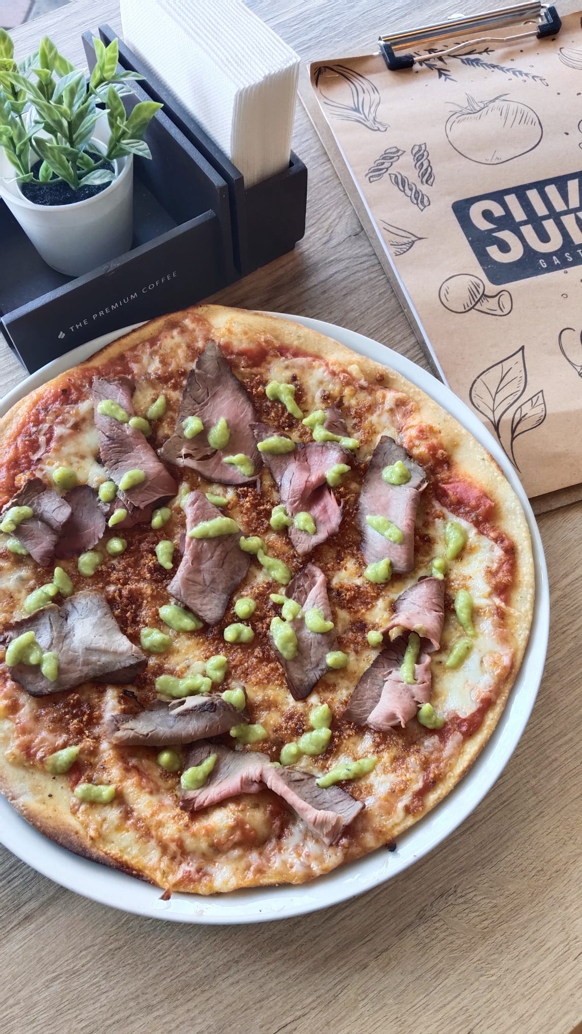 Salsa napolitana, queso mozzarella,  finas laminas de roast beef  ahumado, chorizo criollo, polvo de chistorras y salsa guasacaca
